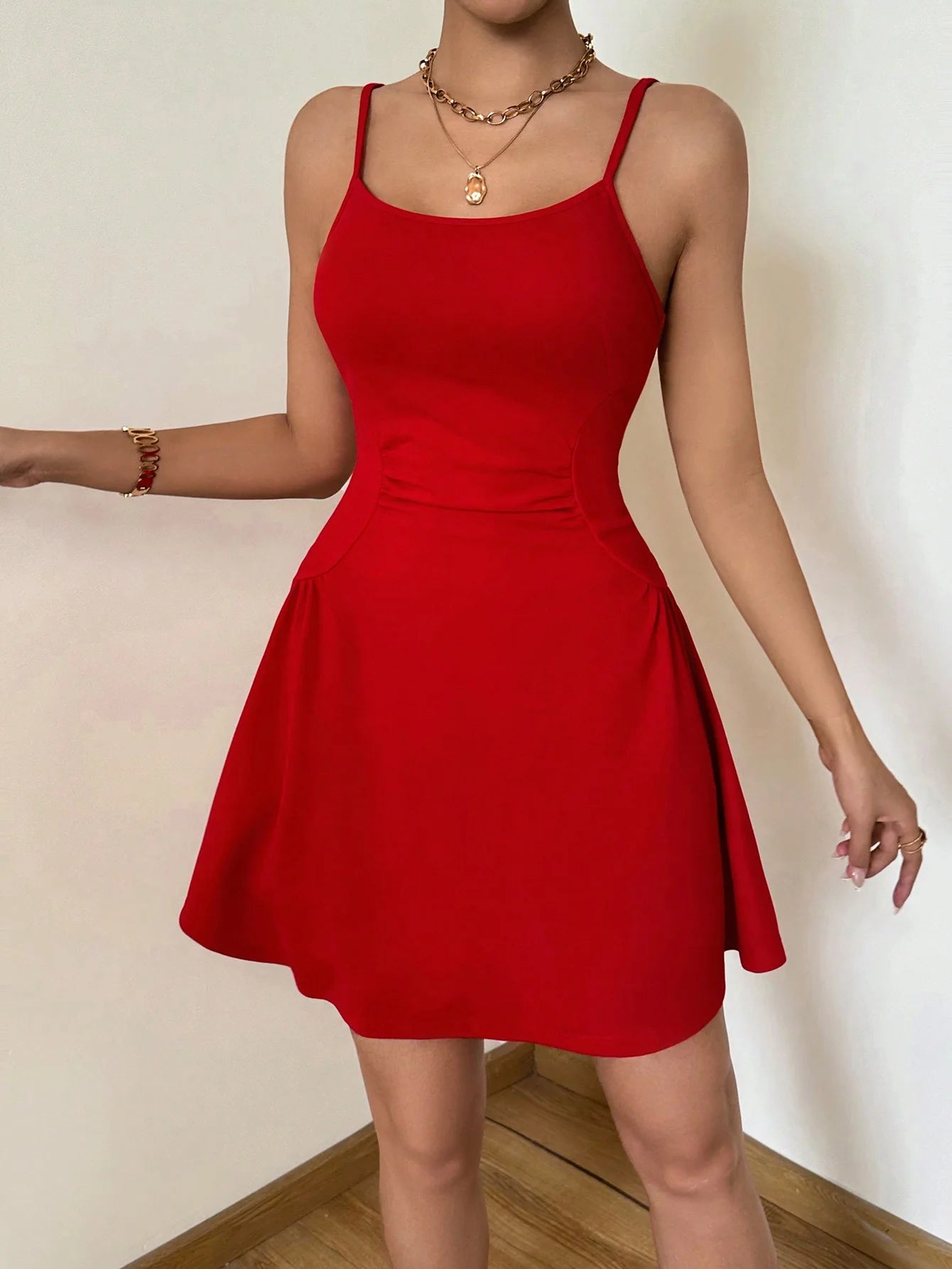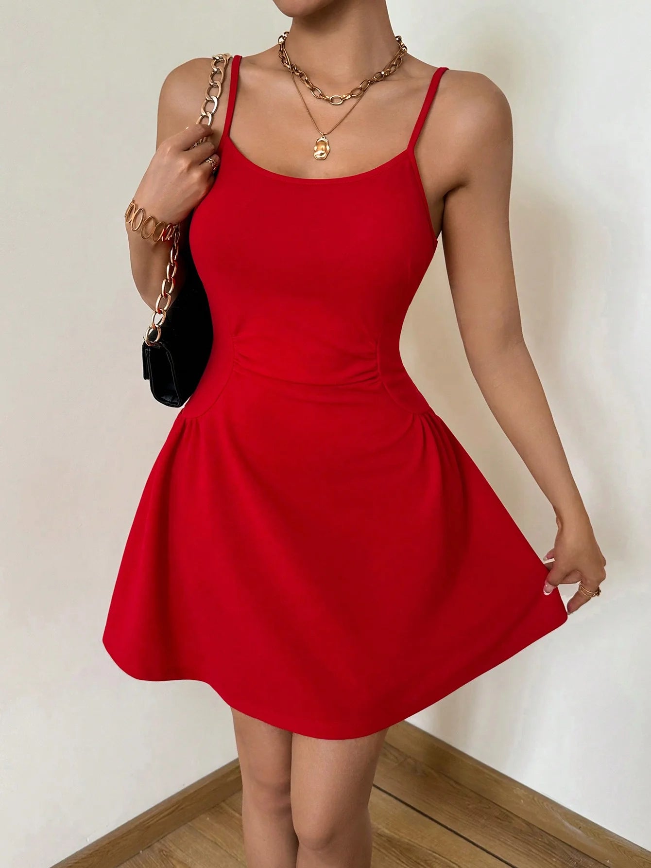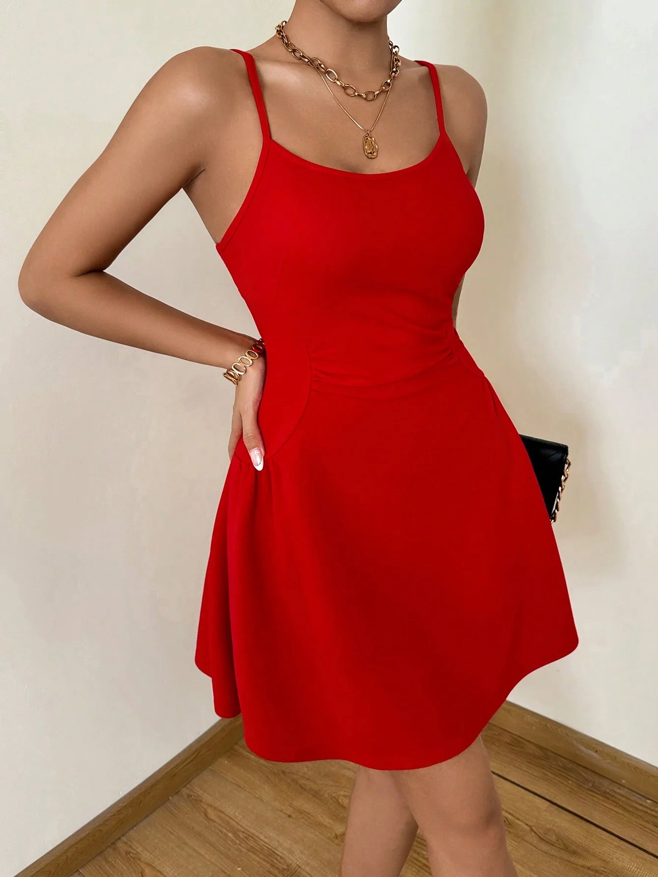 A lady's cinched waist, tight red halter top, A-line mini dress, elegant vacation, daily dance, party