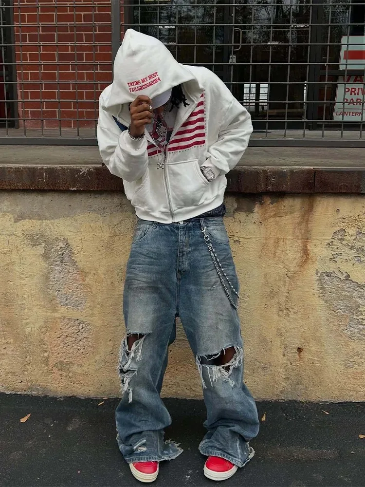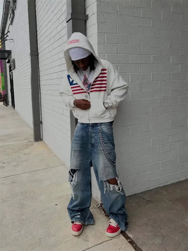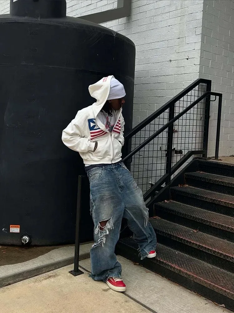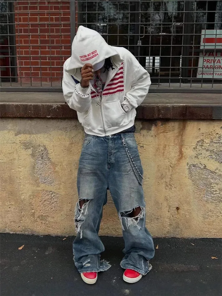 Autumn new national flag minimalist design color collision pattern men hooded sweatshirt Harajuku Y2k loose zipper sweatshirt
