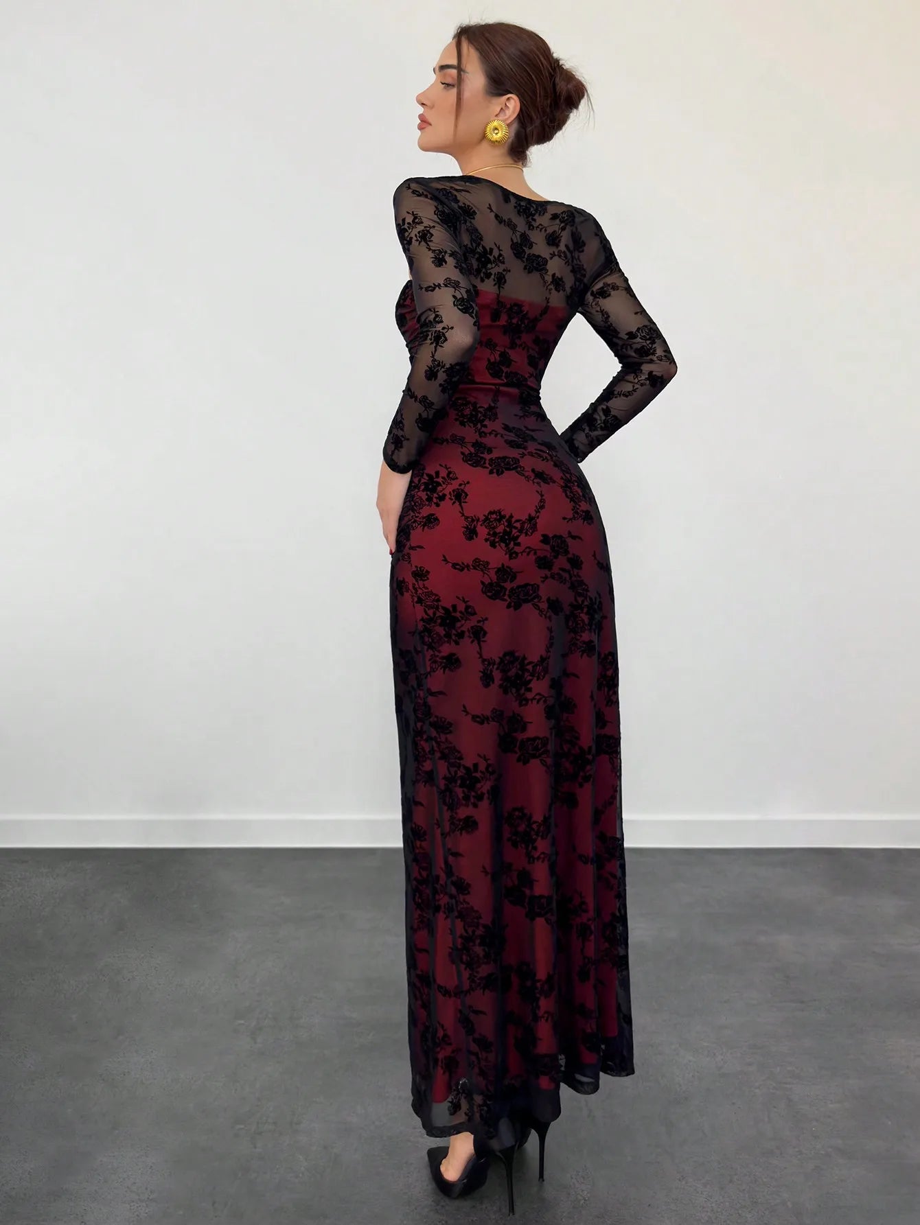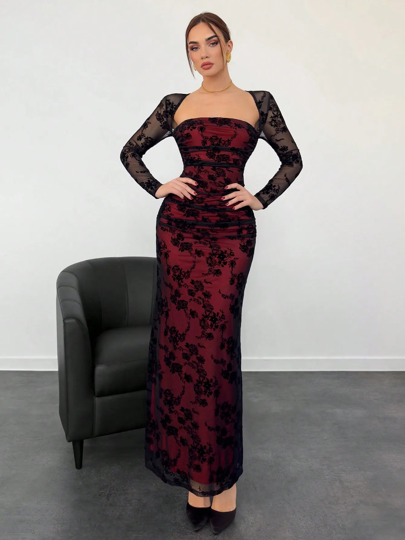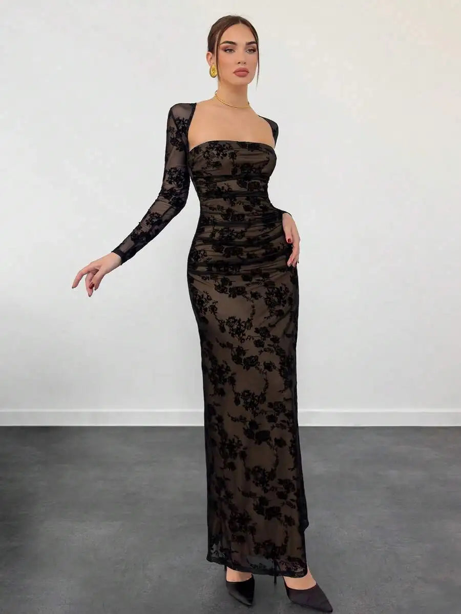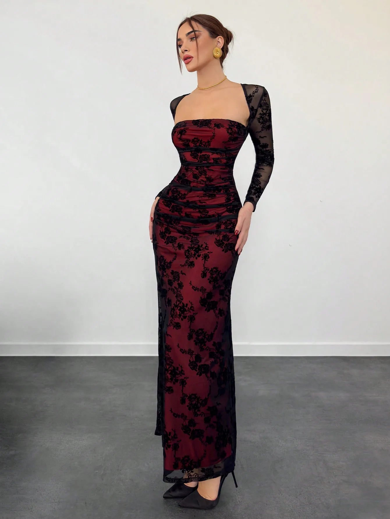 Burgundy Floral Lace Long Sleeve Ruched Bodycon Maxi Dress with Sheer Mesh Sleeves