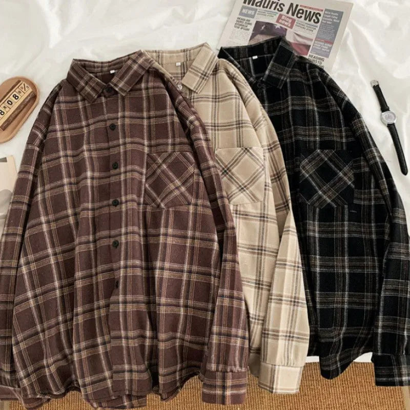 Checkered shirt, women's long sleeved retro Hong Kong style loose oversized top, fashionable and versatile, autumn outerwear