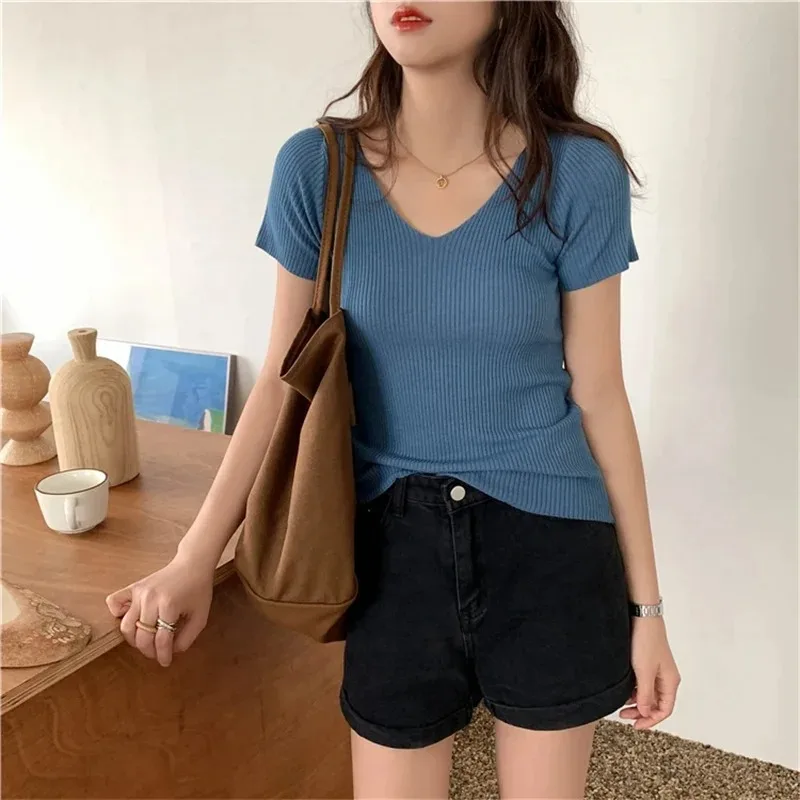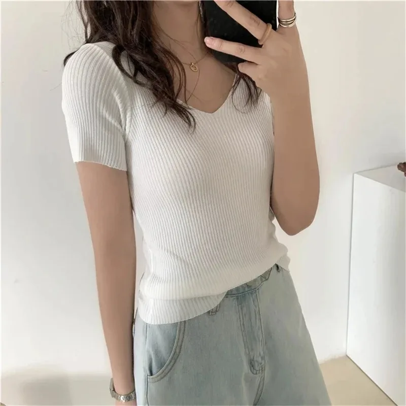 Pullover knitted Short Sleeve knitted Sweater Women Spring Summer Slim Basic Solid Casual Base Female knitting shirts