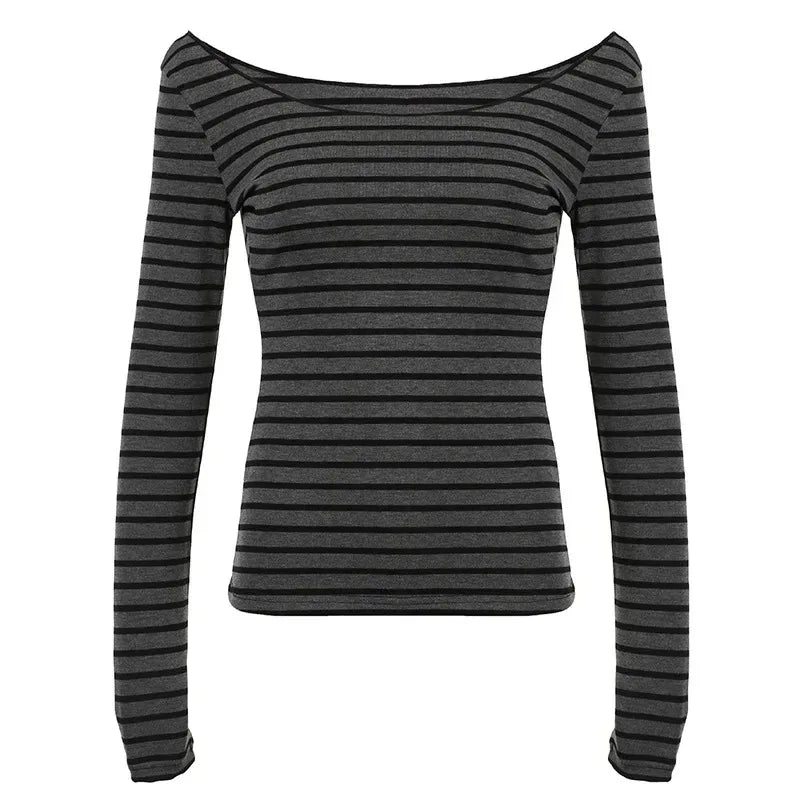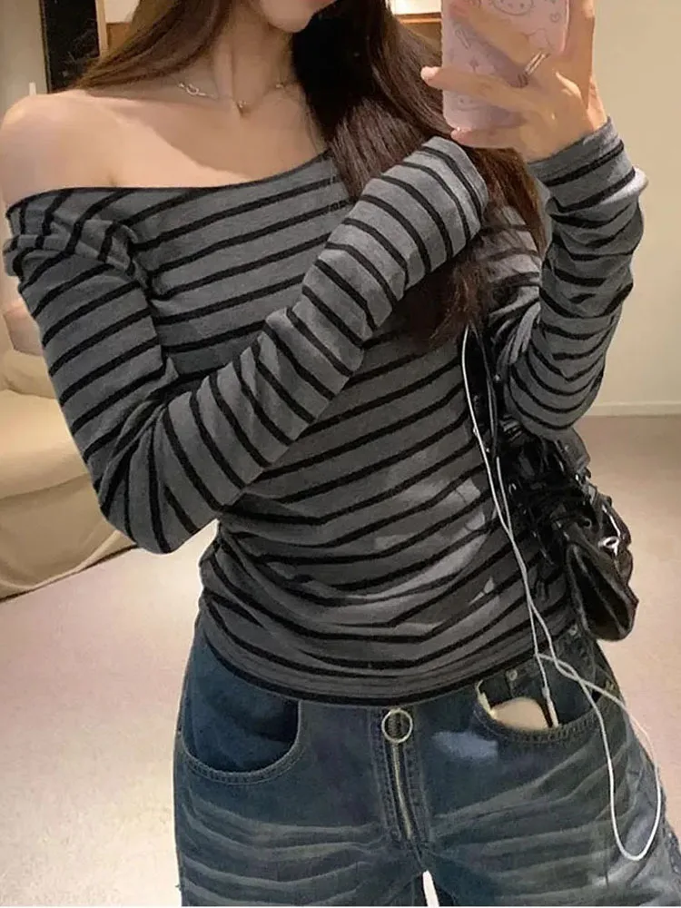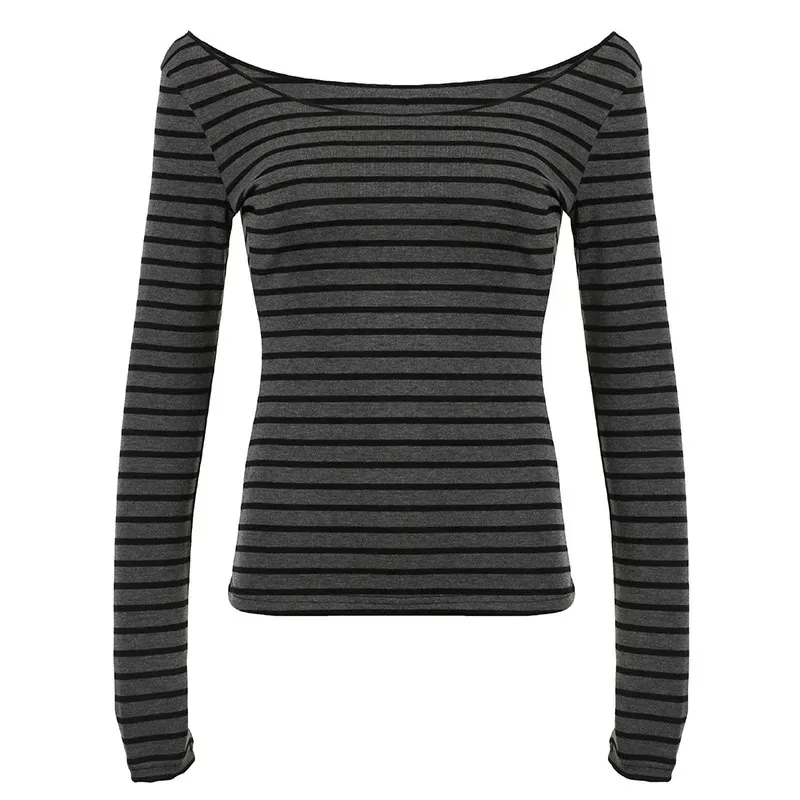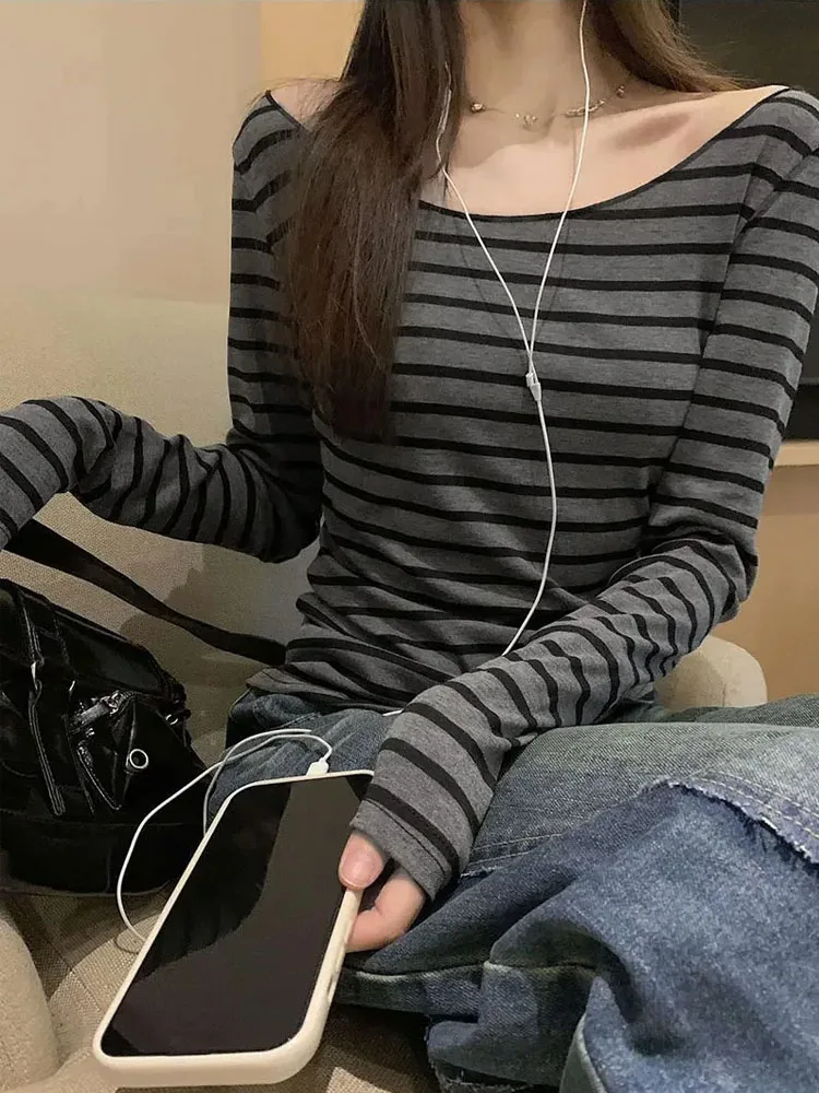 Spring Fall Women's New Japanese Basic Models Slim Long-Sleeved Striped t-Shirt Strapless Korean Street Style y2k Thin Tops