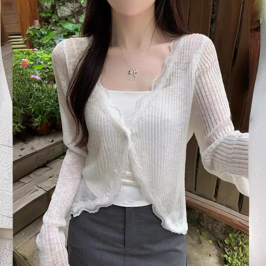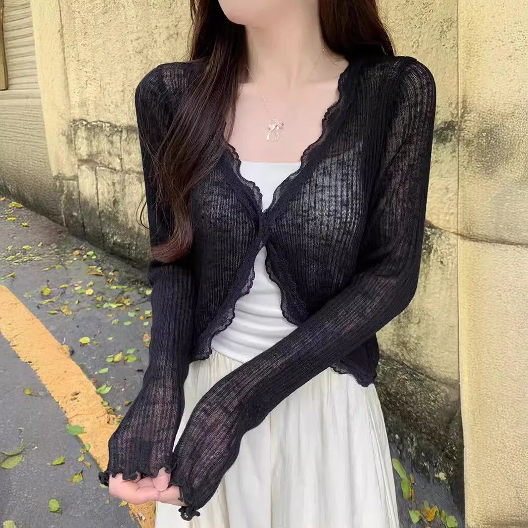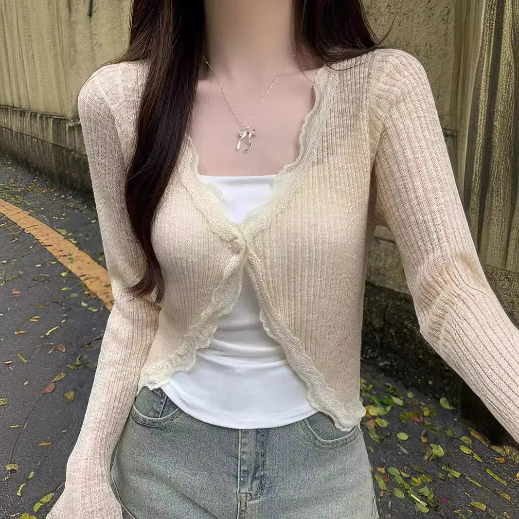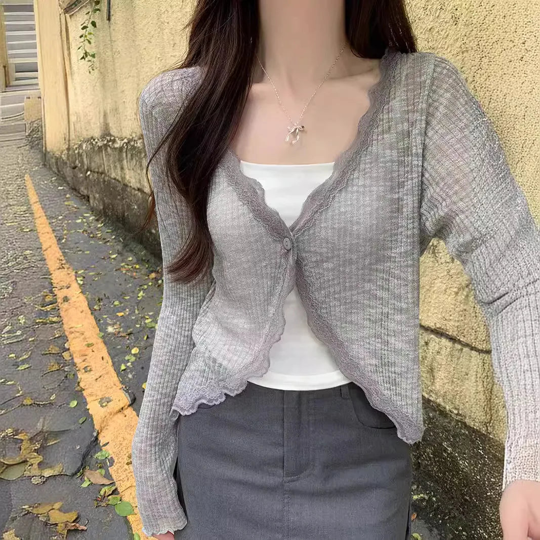 Summer thin knit cardigan with lace trim, single button long sleeved crop top, ribbed knit cardigan, wool sun protection sweater