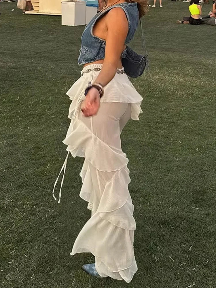 Weird Puss Irregular Tierred Flare Pants Women Y2K Patchwork See Through Summer Hipster Wild Basic Street Trend Classic Trousers