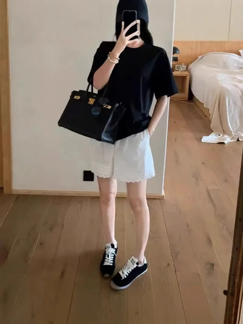 White Lace Trim Patchwork Casual Shorts for Women's High Waisted Wide Leg Vacation Beach Pants Loose Thin Bottoms Home Shorts