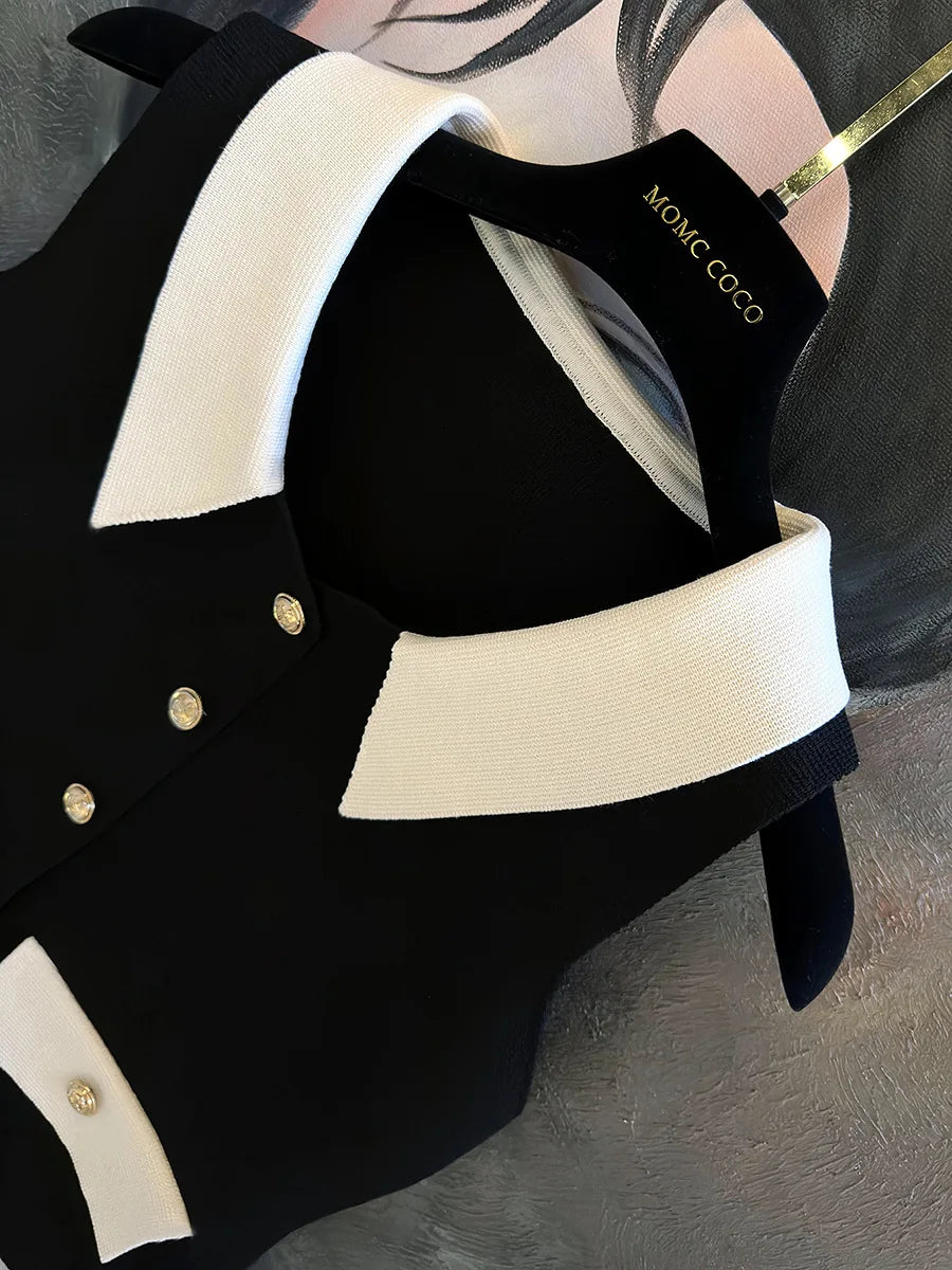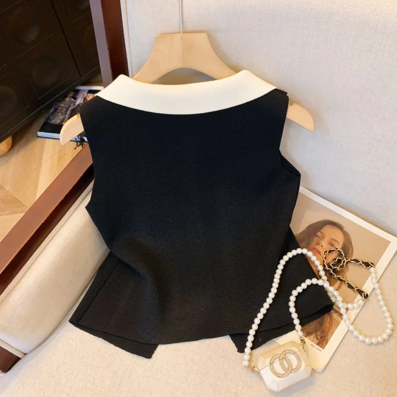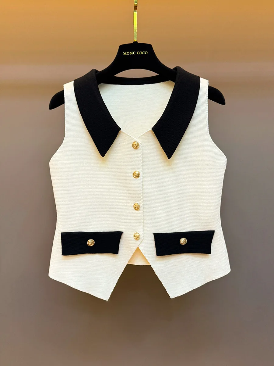 Women French Color Block Sleeveless Vest V-Neck Knit Tank Top Lapel Collar Elegant Preppy Cropped Waistcoat Casual Vest Top