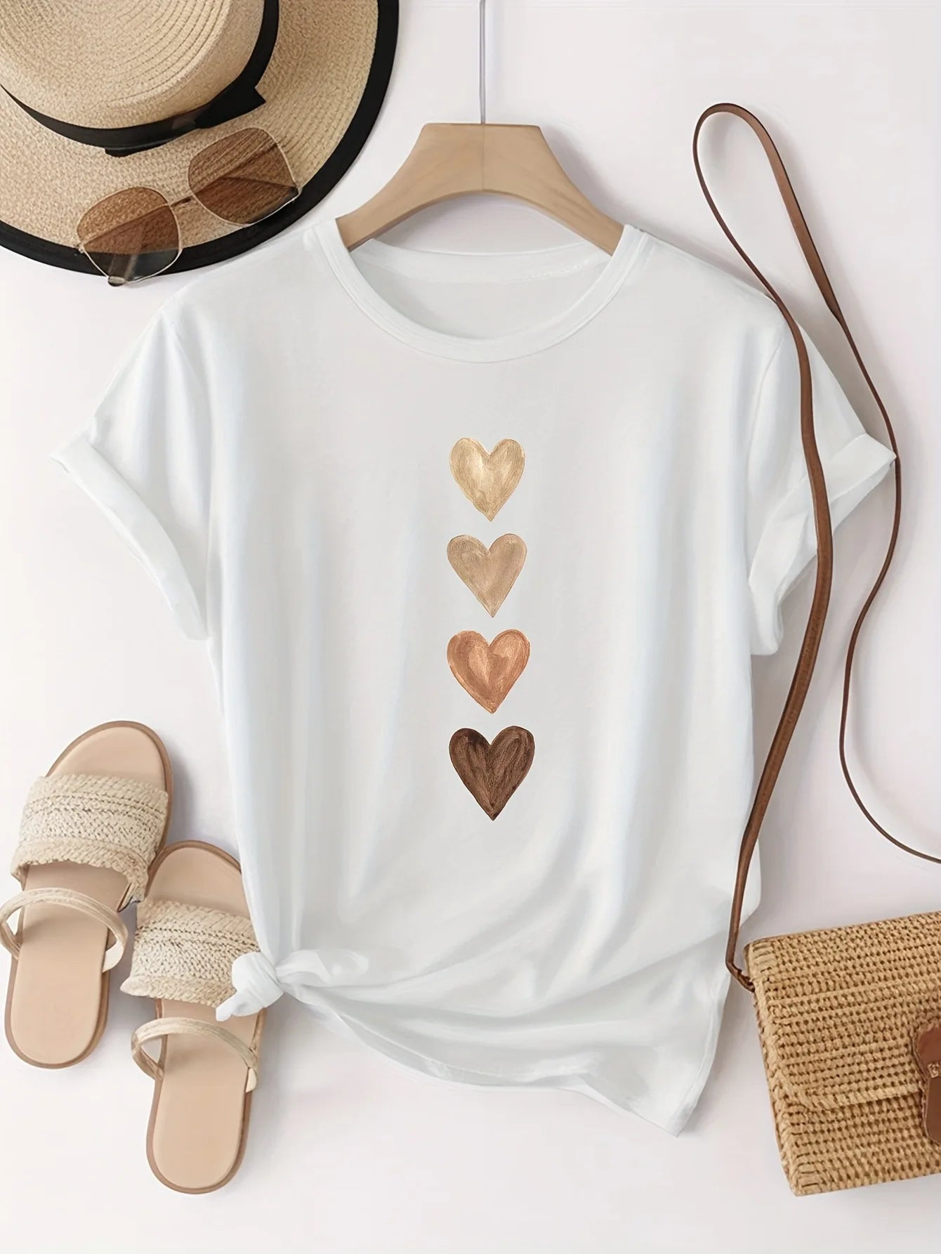 Women's Casual Short Sleeve T-Shirt with Four Heart Graphic Print - Black & Golden, Medium Stretch Round Neck