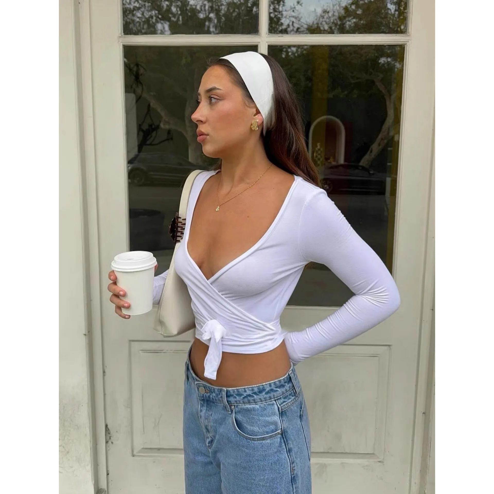 Women's cross wrapped lace up crop top long sleeved deep V-neck solid color slim fit shirt yoga exercise Pilates shirt T-shirt