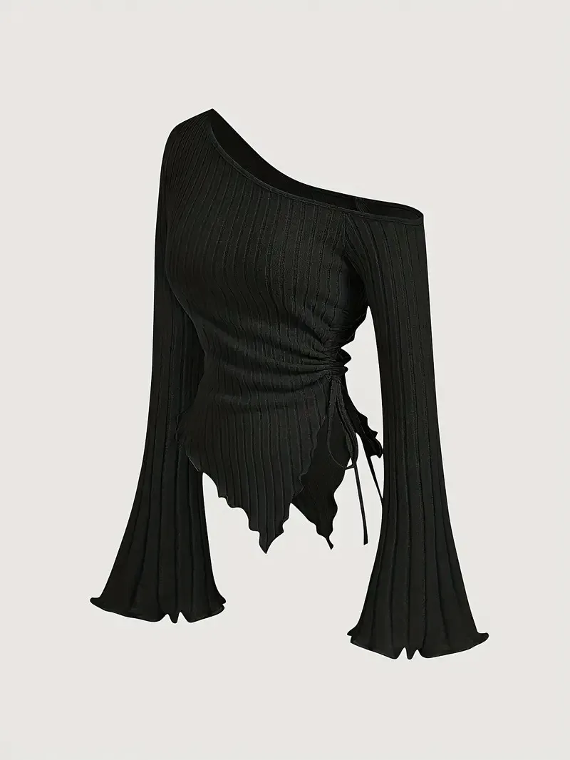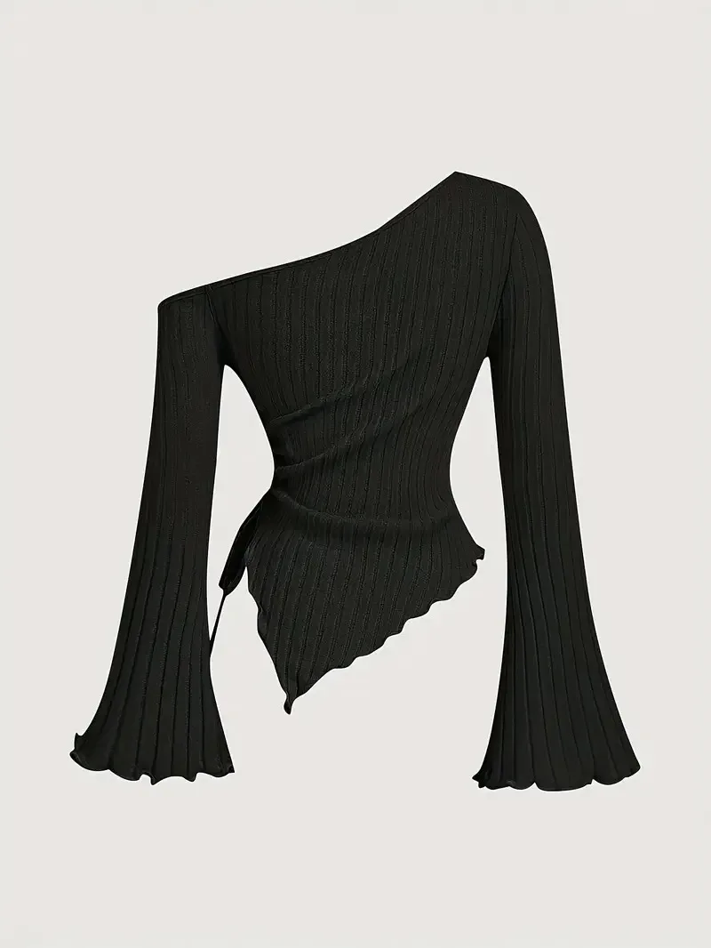 women's New off shoulder cross long sleeved slim fit casual street style asymmetrical elegant T-shirt trumpet sleeve top