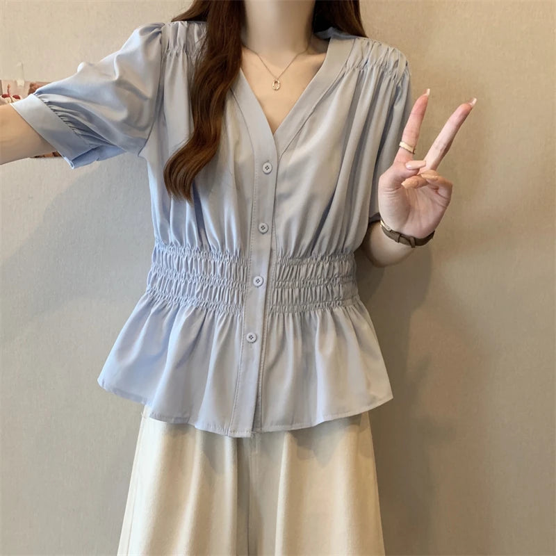 200 Pounds Plus Size Elastic Waist Summer Shirt And Blouse Short Sleeve Solid Top Women's New In Clothes Simple V-neck French