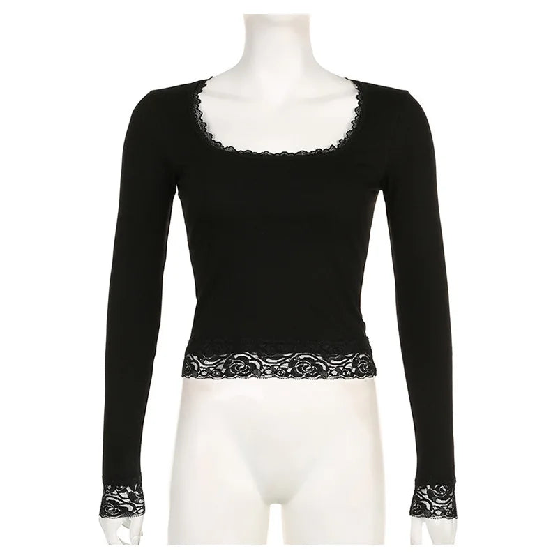 2000s Graphic T Shirt Vintage Fairy Grunge Women Autumn Lace Trim Long Sleeve Slim Fits Tops y2k Clothes Basic Harajuku Tees