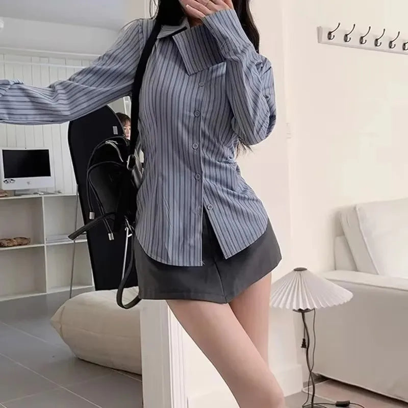 2025 Korean Blue Striped Long Sleeve Shirt Jacket Women's Spring Design Waist Cinching Slimming Top Women Clothing
