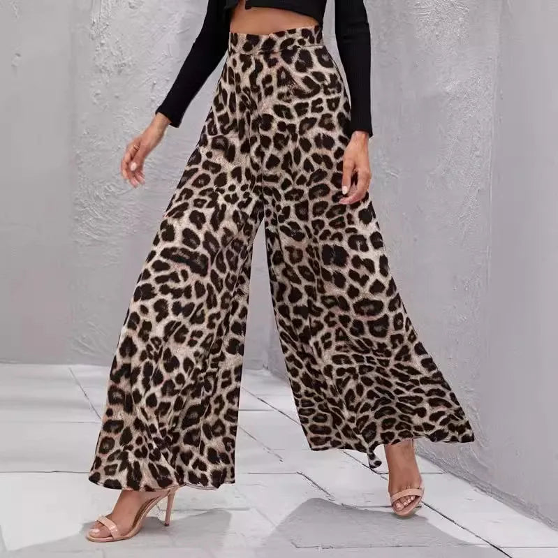 2025 summer INS trendy temperament leopard print casual straight leg women's pants versatile elastic waist wide leg pants