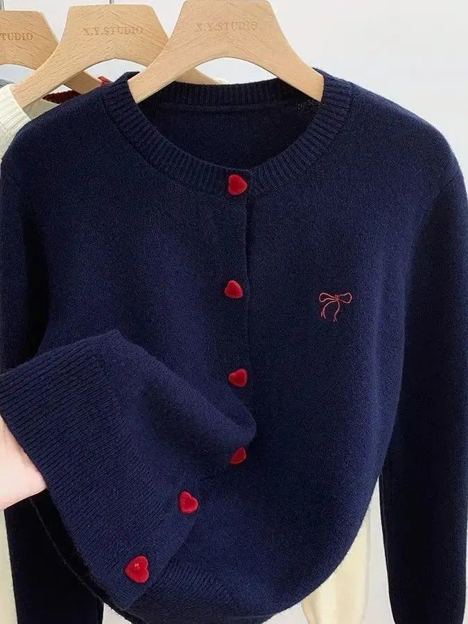 2025 Women Knitted Cardigan Bow Embroidery O-Neck Single Breasted Heart-shaped Button Sweater Korean Casual Solid Knitting Tops