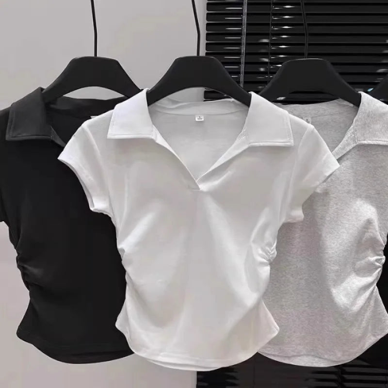 Cotton Summer Sexy Women's T Shirt Skinny Slim Basic Solid Crop Top Short Sleeve Polo TShirtCasual Top Tee for Women