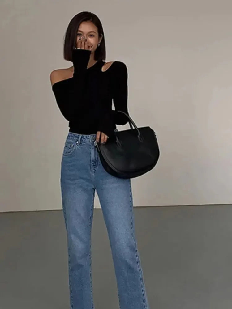 Fashion Skew Collar Off-shoulder Long-sleeved T-shirts Women Spring New Solid Slim Fit Crop Top Sexy Hollow Out Tees Shirts