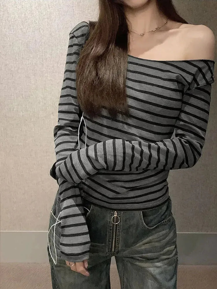 Spring Fall Women's New Japanese Basic Models Slim Long-Sleeved Striped t-Shirt Strapless Korean Street Style y2k Thin Tops