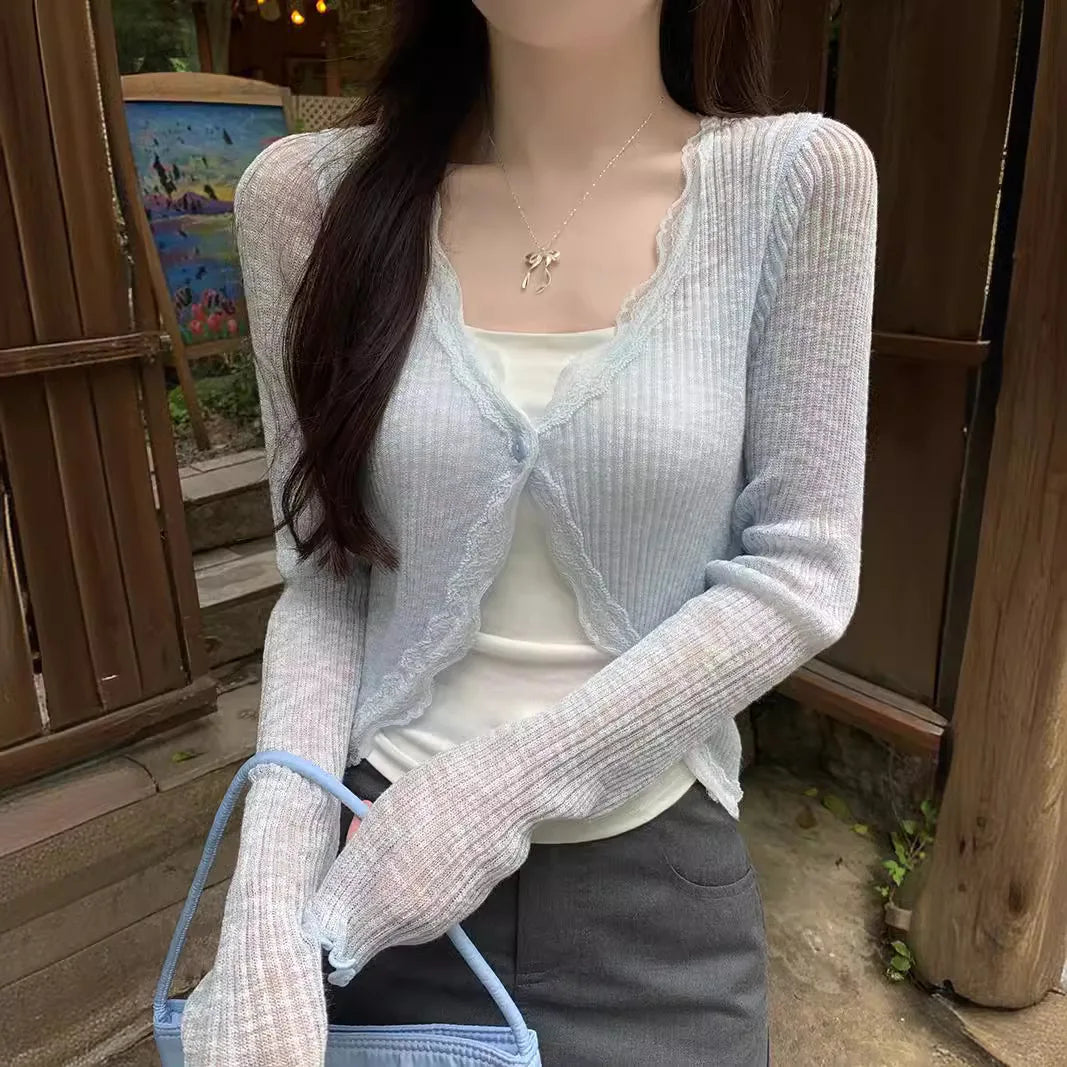 Summer thin knit cardigan with lace trim, single button long sleeved crop top, ribbed knit cardigan, wool sun protection sweater