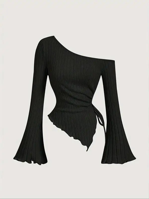 women's New off shoulder cross long sleeved slim fit casual street style asymmetrical elegant T-shirt trumpet sleeve top